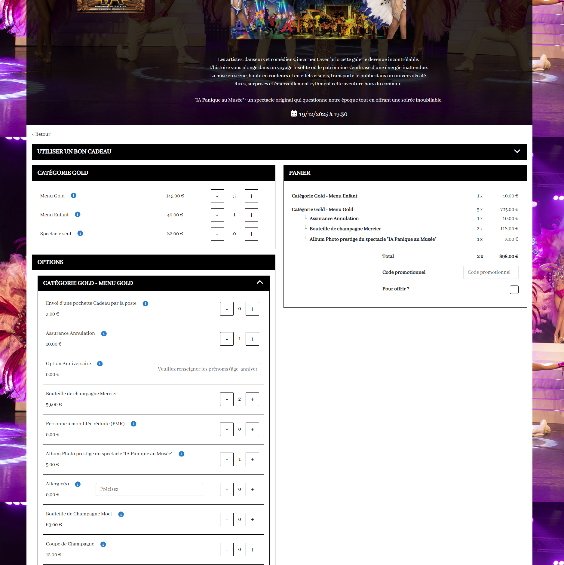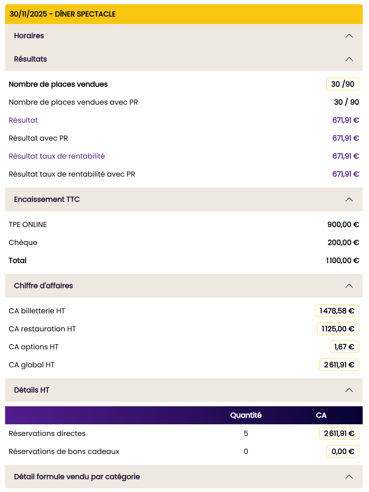 Gestion des réservations pour les Cabarets - Théâtres - salles - Producteurs - Festivals ... - Un outil simple qui vous permet de gérer vos réservations, Formules, catégories, options, panier ... Gestion de votre Billetterie - Création de vos billets personnalisés, Placés, non placés Gestion du plan de salle - Créer vos propres plans de salle illimités. Placement automatique de vos billets ou manuel. Choix du placement par le client. Logiciel de caisse intégré - La caisse enregistreuse vous permet de vendre sur place ou en ligne. Gestion de votre bar, boutique. Précommande. Plus d'abonnement supplémentaires pour une ou plusieurs caisse. - Carte via Qrcode pour une commande directe des clients. Pads pour les serveurs. (appli android) Gestion des Cartes cadeau - Création de carte cadeau ou chèque cadeau. Statistique de vos événements - Vous contrôlez en temps réel vos taux de remplissage et votre rentabilité. Gestion Facturation - Gérer vos factures et encaissements. Factures électroniques pour les professionnels - Envoi lien de payement E-mail (gratuit) Compte client - Vos clients peuvent avoir accès à leur compte. Rajout d'option, factures, billets... - Précommande. Bar, goodies - CRM