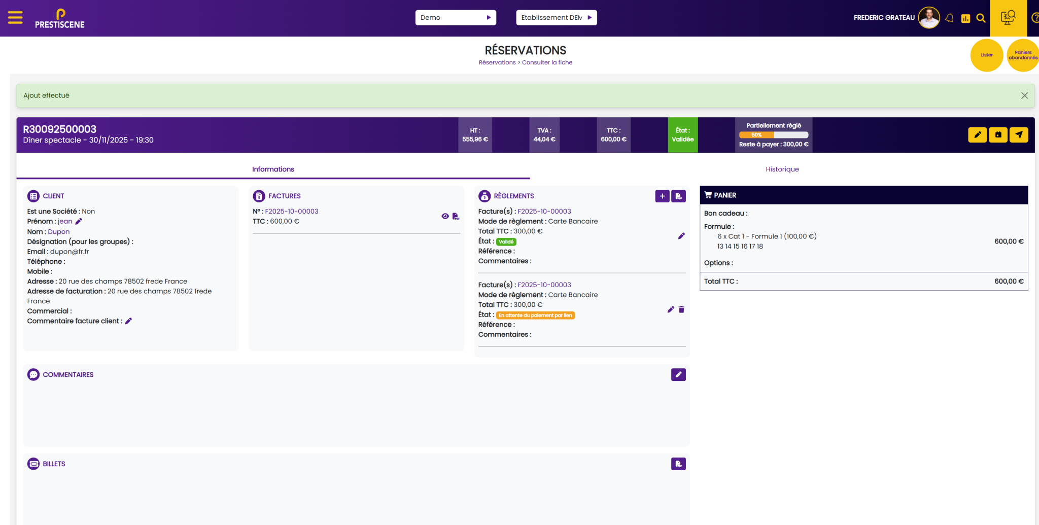 PRESTISCENE est un logiciel complet pour les cabarets, producteurs et théâtres, offrant une gestion intuitive de vos clients, réservations et devis. Grâce au mode panier, vos clients réservent plusieurs services en une seule commande. Ajoutez facilement des produits complémentaires, proposez la précommande d’articles au bar ou en boutique, et facilitez le service en salle avec des notes d'information dédiées. Suivez vos factures, paiements et encaissements en temps réel. Automatisez vos relances par e-mail et boostez vos ventes avec des codes promo, cartes cadeaux et produits dérivés. Une solution sans commission, tout-en-un, pensée pour simplifier votre quotidien.